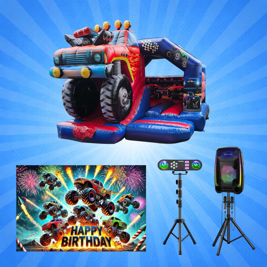 Our 3D Monster Truck Indoor Party Package with Slide is an exciting all-in-one setup perfect for action-packed birthday parties and vehicle-themed celebrations. This package includes a 3D monster truck themed bouncy castle with slide, a disco light stand, a monster truck Happy Birthday backdrop and a powerful Bluetooth speaker.