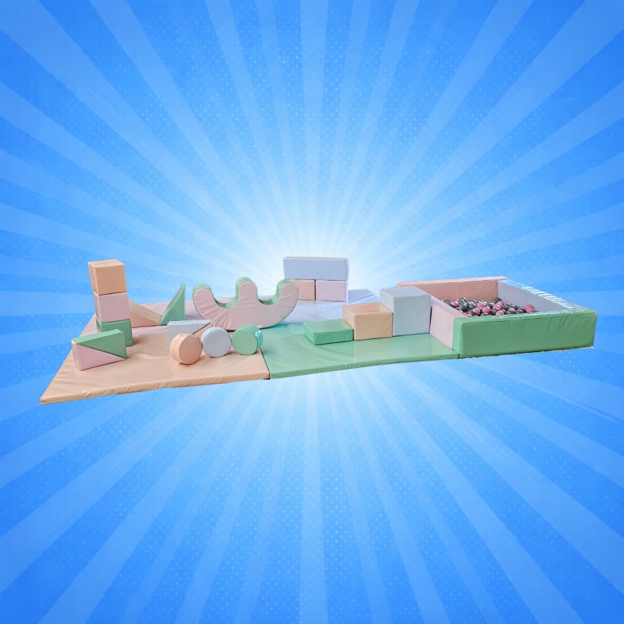 , this pastel setup includes 18 soft play shapes, a matching ball pool and premium thick foam safety matting.