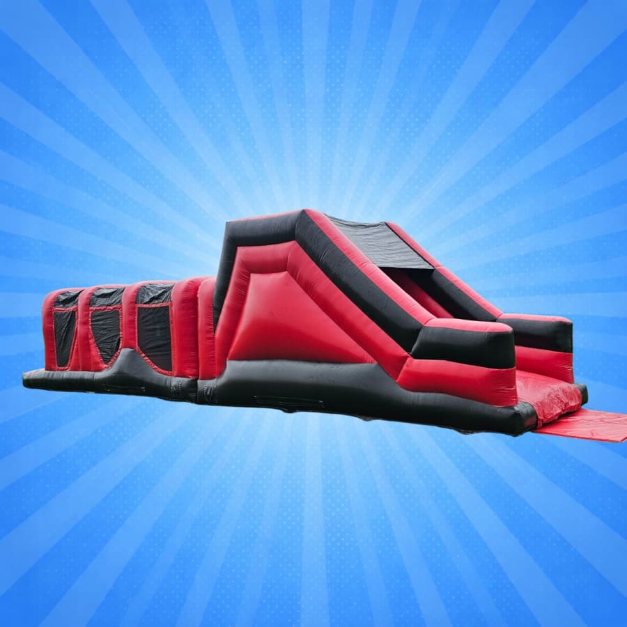 Assault Course Hire Wakefield — a high-energy inflatable obstacle course packed with tunnels, climbing challenges and a thrilling slide finish. Its bold red and black design makes it ideal for school events, birthday parties and organised celebrations.