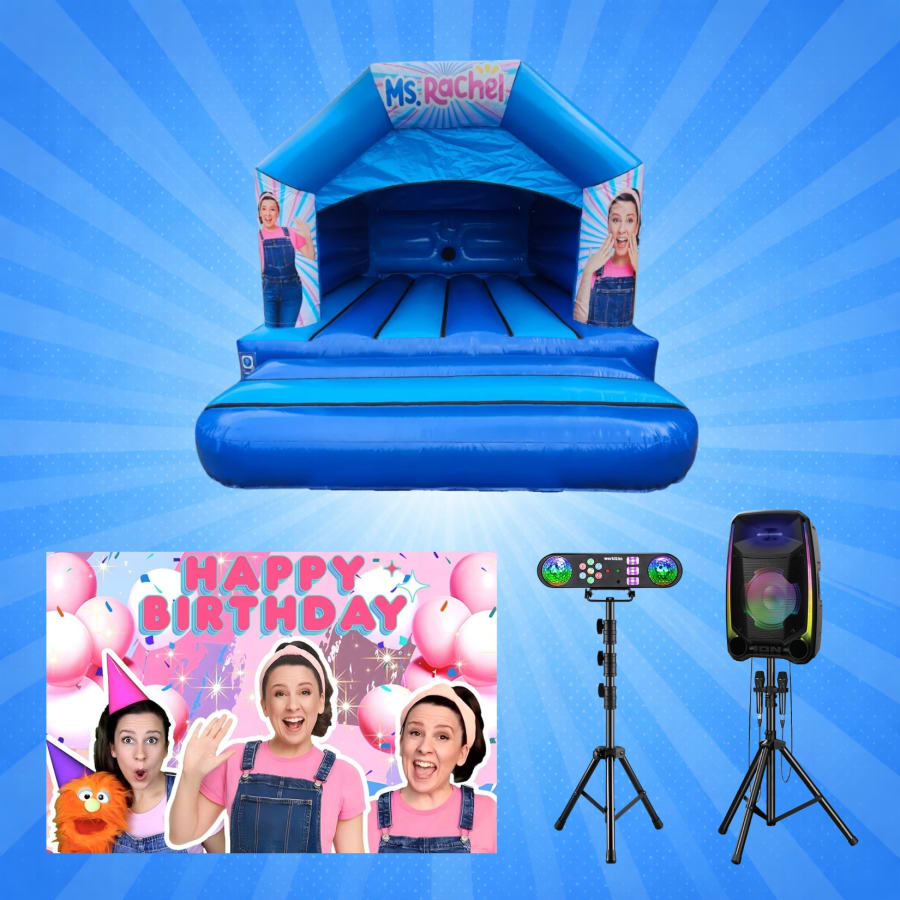 Our Ms Rachel Indoor Party Package – Bouncy Castle & Disco is perfect for toddlers and young children, featuring a themed bouncy castle, disco lights, a birthday banner and a Bluetooth speaker with optional karaoke microphone.